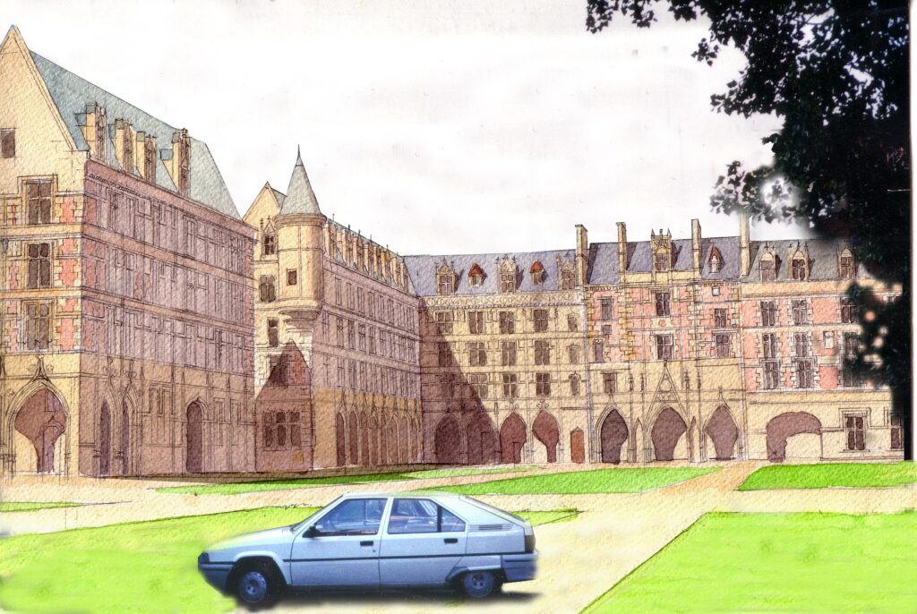 Evoquant Cambridge ou Oxford, ce contre-projet de style néo-renaissance reprend les mêmes gabarit que les bâtiments existants. Le décor en est emprunté à l’hôtel de Sens et à l’hôtel de Cluny. Naturellement, l’infâme tour disparaît, celle-ci faisant plus de dégâts encore, par les abords qu’elle défigure, que la tour Montparnasse. Inutile de la consever, même en lui donnant un aspect de beffroi ou de cathédrale, ce à quoi j’ai pensé avant d’y renoncer…