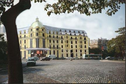 La proposition ci-dessous tient compte du programme, qui comportait entre autre un cinéma. L’architecture des cinémas du début du siècle, comme celle cafés, a produit des merveilles, dont la plus grande partie, hélas à été démolie (versons une larme sur le Gaumont Palace d’avant guerre, refaçadé puis démoli) Je me suis inspiré de ces exemples d’autrefois (rotonde d’angle). Avec ses pavés (jusqu’à quand?) ses arbres, son charmant square, la place d’Italie, débarassée des horreurs du XIII ème arrondissement, pourrait redevenir un lieu tout à fait plaisant… Il n’en est malheureusement pas question.