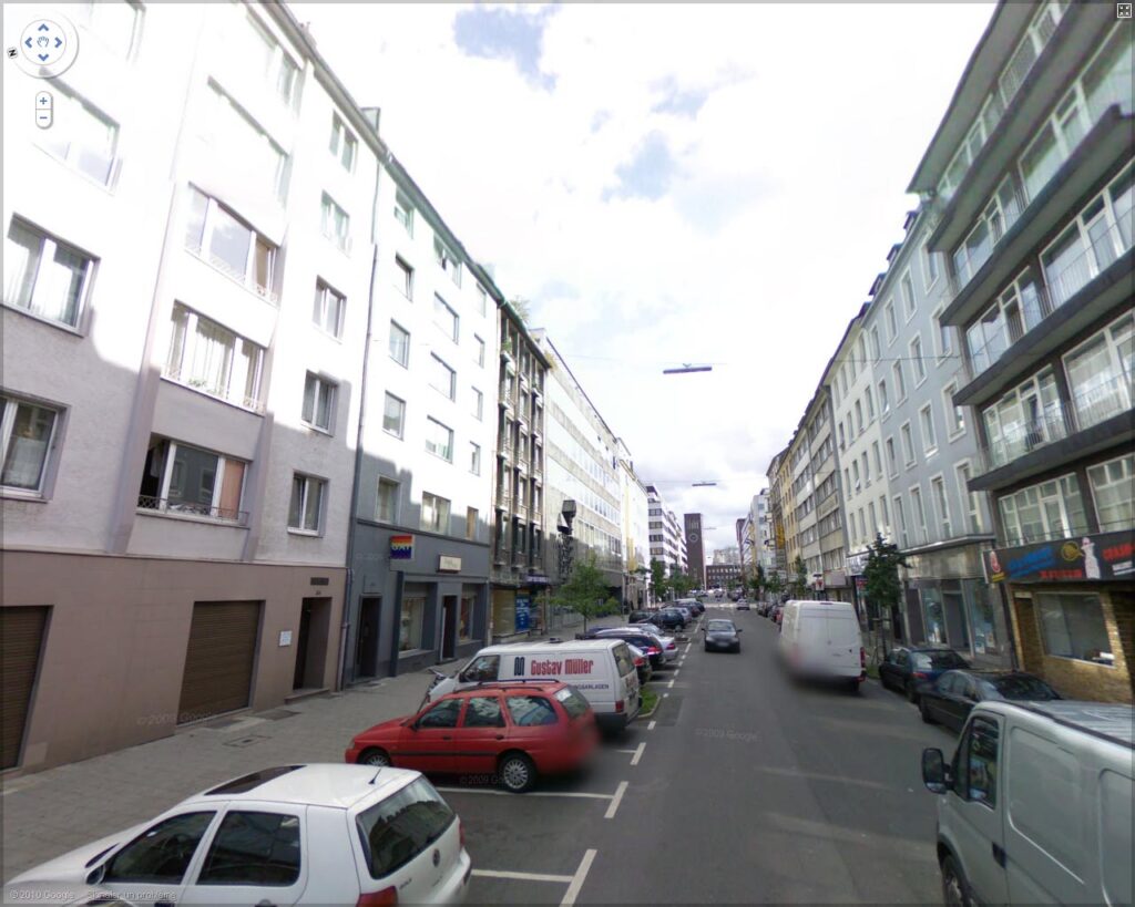 BismarckStrasse, Düssedorf, Allemagne. Cette rue, absolument dépourvue de cachet et d’intérêt, uniquement constituée d’immeubles des années 50-60 reconstruits après la guerre, est plus basse que le gabarit haussmannien parisien. On peut donc être bas, et néanmoins très laid. On n’offre jamais deux billets pour un voyage en amoureux à Düsseldorf. Pourquoi ? Aux architectes de répondre… Cliquer sur l’image pour agrandir. Photo GoogleStreetView